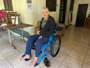 Cândido Godói/RS – Em uma emocionante cerimônia realizada no dia 26/10/2024, o Rotary Club de Cândido Godoi–Terra do Gêmeos proporcionou uma nova oportunidade de vida ao beneficiário Flávio Roque Heck, de 76 anos. Flávio Roque, residente na Área rural de Cândido Godói, recebeu uma cadeira de rodas da renomada organização internacional Free Wheelchair Mission. A